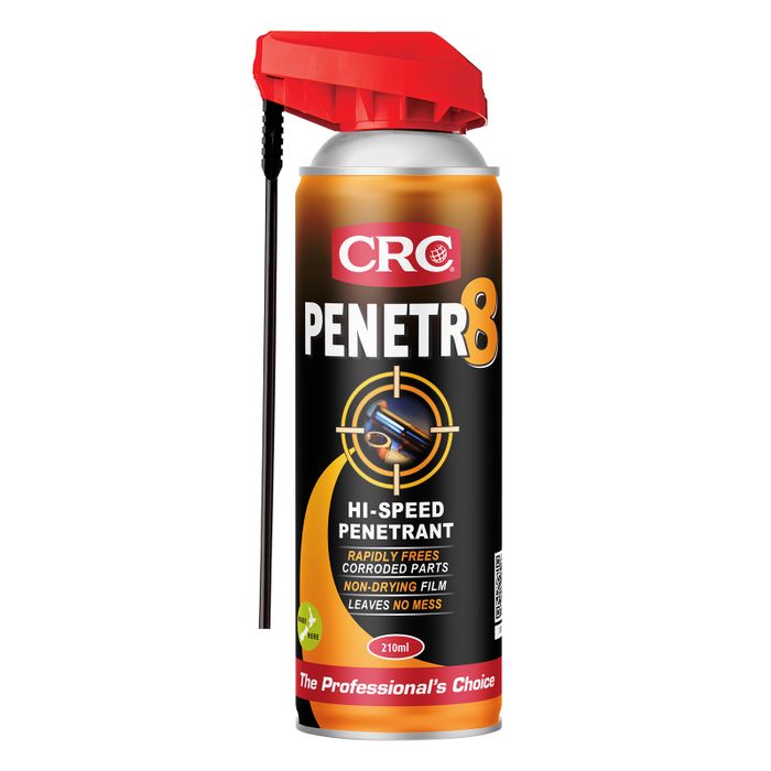 CRC Penetr8 is an industrial strength, low viscosity lubricant and penetrant designed to quickly loosen and free seized, bound or frozen fasteners. CRC Penetr8 quickly permeates rust, scale, gum, grease and corrosion with a low surface tension liquid penetrant formula. It creeps into cracks, seams, threads and joints with great efficiency and leaves a thin non-drying colourless film with outstanding lubrication and corrosion inhibiting properties.