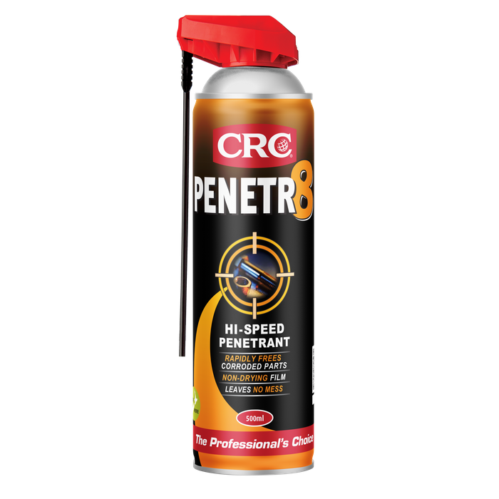 CRC Penetr8 is an industrial strength, low viscosity lubricant and penetrant designed to quickly loosen and free seized, bound or frozen fasteners. CRC Penetr8 quickly permeates rust, scale, gum, grease and corrosion with a low surface tension liquid penetrant formula. It creeps into cracks, seams, threads and joints with great efficiency and leaves a thin non-drying colourless film with outstanding lubrication and corrosion inhibiting properties.