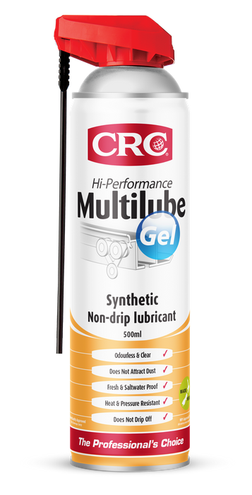 Applied as a clear oil with excellent capillary action CRC Multilube Gel penetrates quickly into tight areas before solvents evaporate leaving a waterproof load bearing gel that stays in place and withstands high pressure and shock load conditions. The speedy shift in viscosity provides both, excellent penetration action and premium staying power.
