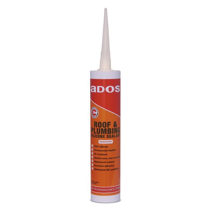 ADOS Roof & Plumbing Silicone is specially formulated and translucent in colour for use with zinc coated/galvanised metal products, aluminium frames and fiberglass to glaze, seal and waterproof.