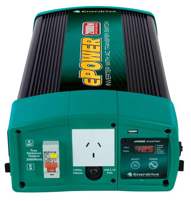 The ePOWER 2000W Inverter with AC Transfer & Safety Switch is one in a family of affordable, high quality, professional level inverters by Enerdrive. By using the latest power conversion technology, ePOWER inverters deliver clean and energy efficient true sine wave AC power from your DC supply.